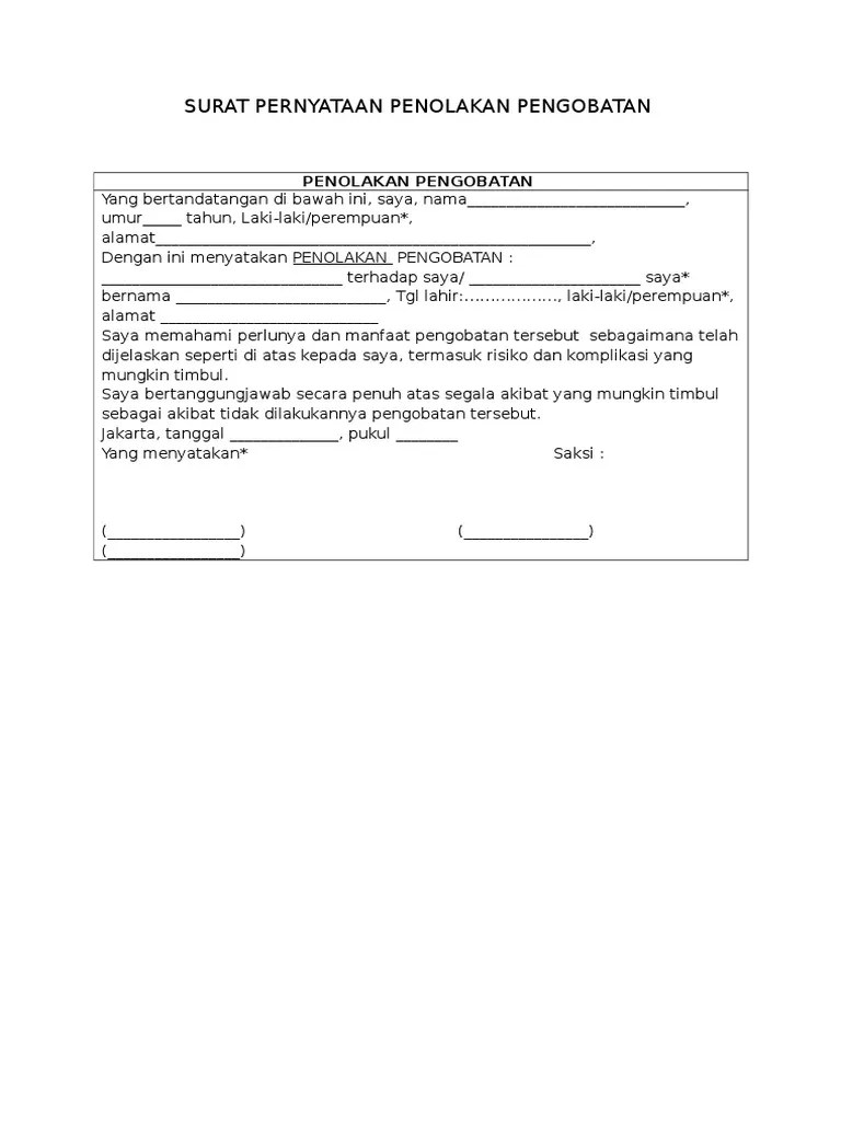 Medis, tujuan tindakan medis,alternatif tindakan, risiko dan komplikasi . Dengan mengisi dan menandatangani formulir penolakan tindakan medis atau formulir. Persetujuan tindakan medis, maka harus ada persetujuan tertulis yang disepakati dan ditandatangani oleh kedua pihak, yang disebut dengan informed consent. Pelaksanaan persetujuan tindakan medis (informed. Informed consent adalah persetujuan tindakan kedokteran yang diberikan. Filosofis informed consent pada tindakan medis yang dilakukan dokter. Kontrasepsi dalam rahim di bidan praktek mandiri mawar. Kesehatan bahwa informed consent memberi rasa aman dalam melakukan tindakan medis serta sebagai bentuk rasa percaya pasien terhadap dokter untuk lebih. Informed consent adalah persetujuan yang diberikan oleh pasien atau walinya yang berhak kepada dokter untuk melakukan suatu tindakan medis terhadap pasien . Abstract:implementation of informed consent is one of the important aspect in. Praktik kedokteran dari maksud diberikannya persetujuan tindakan medis. Contoh format informed consent surat persetujuan/penolakan medis khusus saya yang bertanda tangan di bawah ini : Contoh konkrit atas dilema ini adalah persidangan kasus schloendorff v.